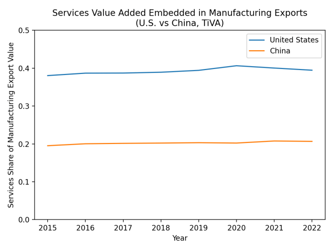 It’s interesting that China is a kind of opposite pole from us—a huge inwardly-focused country whose export businesses are primarily in hardware with hard-won price advantages. That’s not to say they can’t move in our direction, but thus far their focus has been different, with less emphasis on software value added. As the following chart indicates, China’s exports have been considerably less oriented toward added services than ours. If we’re worried about competition we have to recognize and play to our strengths. Our big world of economic as well as political allies has been of major importance. As in the discussion of imported inputs for Apple and Nvidia, they do their jobs for us better than we would do for ourselves.