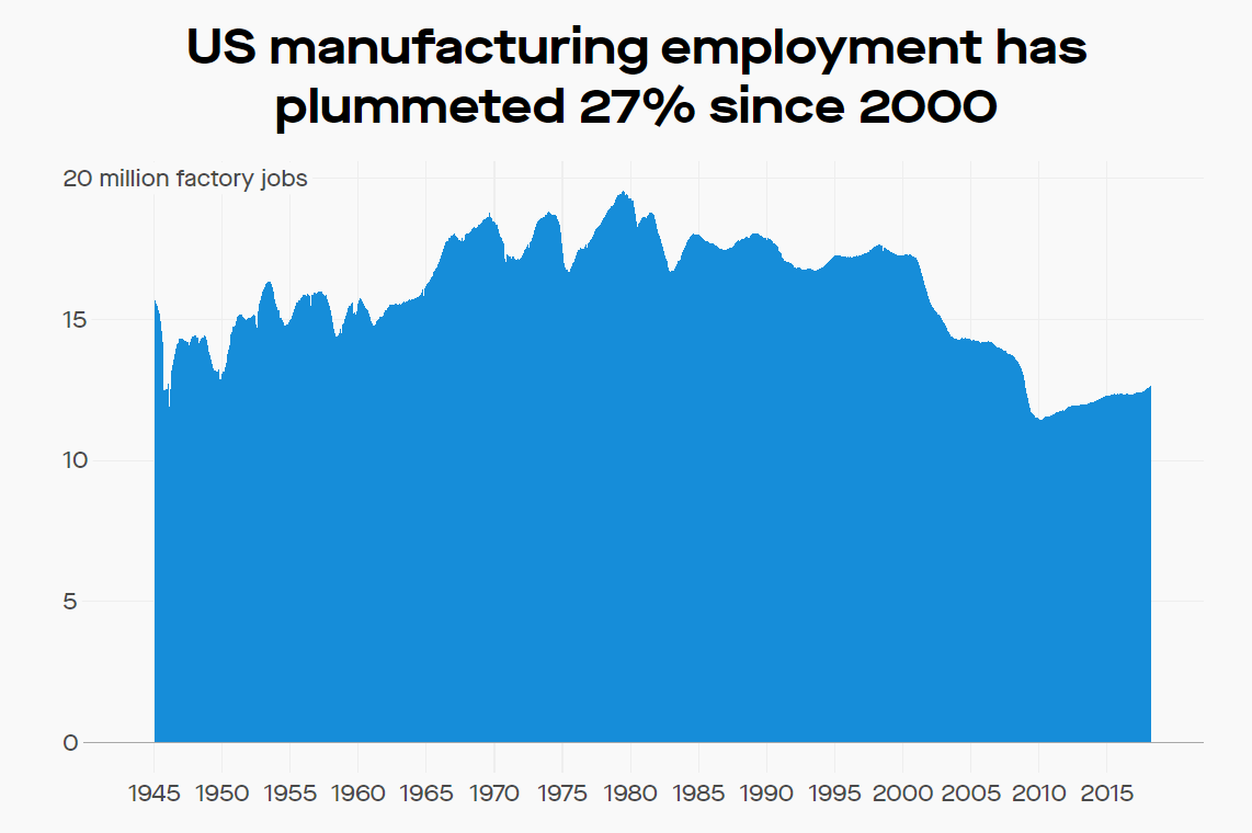 I’ll start with Obama’s first term. George W. Bush left a mess so bad that it is only partially acknowledged. The stock market crashed and the economy was shutting down (basically from what amounted to misguided deregulation of the overall banking system through mortgage-backed securities). But that wasn’t the whole story. Hidden behind the smokescreen of “neoliberalism” was the fact that essentially all of the job loss to China occurred either during Bush’s administration or with their crash. Just look: